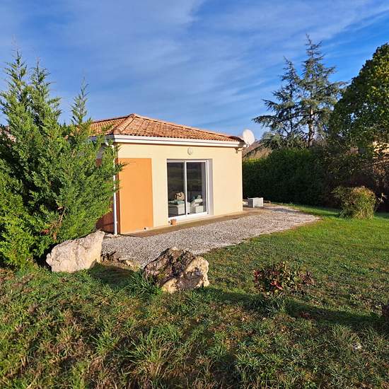 AUCH - Sortie de ville direction Toulouse Dans quartier résidentiel, VILLA de 2011 au calme de plain pied sur un terrain de 525 m². Composée d'un séjour exposé Sud-Est, cuisine américaine aménagée et équipée (plaque vitrocéramique + hotte) avec accès terrasse + cellier, 3 chambres avec placard, salle d'eau et wc séparé. Double vitrage, chauffage électrique, volets roulants. Abris jardin. Belles prestations. Disponible le 20 / 12 / 2025 / .