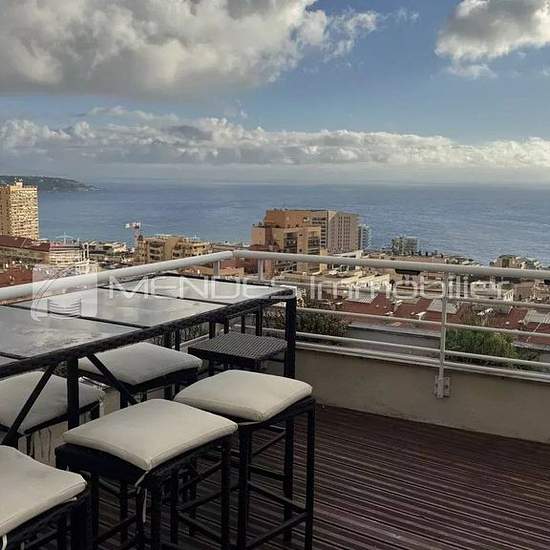 A louer : luxueux Penthouse de 92m2 avec sa vue panoramique sur la Principauté et le casino. Ce havre de paix est reparti sur deux niveaux: Le premier composé d'un vaste living room, de trois chambres et deux salles de bains ,le tout est décoré avec gout et prestations de qualités. Vous profiterez enfin de sa magnifique terrasse sur le toit avec jacuzzi, barbecue, espace repas et sa vue imprenable sur Monaco et la mer. Situé proche de la frontière de Monaco avec accès direct aux escaliers roulants. Une très grande place de parking et une cav...