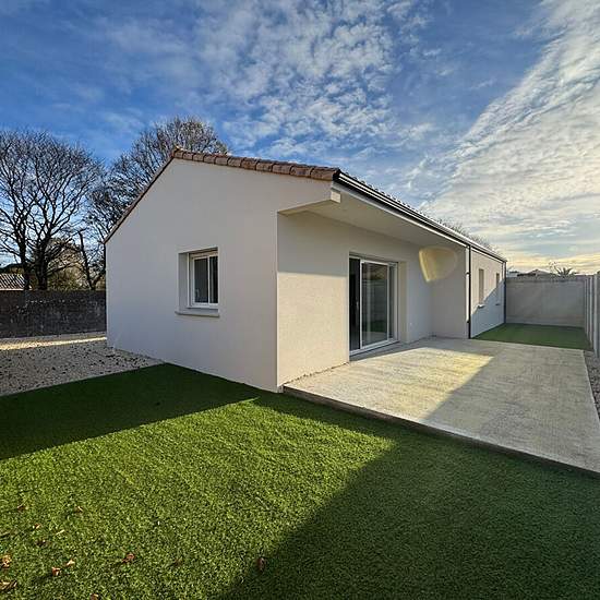 CHAUMES EN RETZ - Chéméré - Maison de plain-pied neuve comprenant une entrée avec rangements, une buanderie, une pièce de vie avec cuisine aménagée/équipée (four, plaque à induction, hotte) et un dégagement distribuant 3 chambres avec placards, une salle d'eau et un wc suspendu séparé. Une dépendance fermée pour stockage vient compléter ce bien sur une parcelle entièrement clôturée d'environ 370m². Libre à partir du 1er Décembre 2025 Loyer 1050 euros + 30 euros de provisions pour charges (taxe d'enlèvement des ordures ménagères et entretien ...
