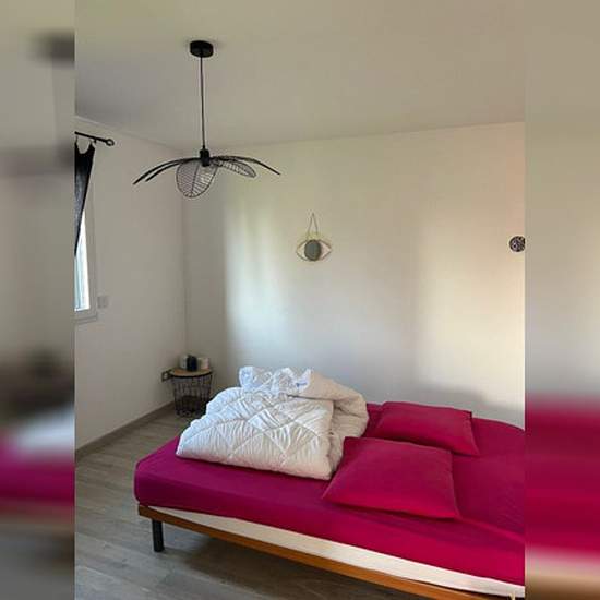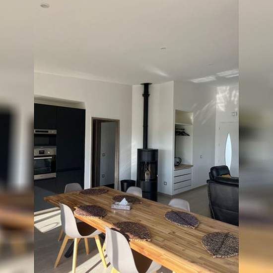 Maison meublée de plain pied comprenant : Pièce à vivre, coin cuisine aménagé et équipé (plaques induction, four, micro ondes, lave vaisselle, réfrigérateur), 3 chambres, salle d'eau, wc, buanderie, garage (porte motorisée). Portail électrique, jardin clos de 600 m². Chauffage poêle à granules. LIBRE AU 1er MAI