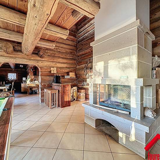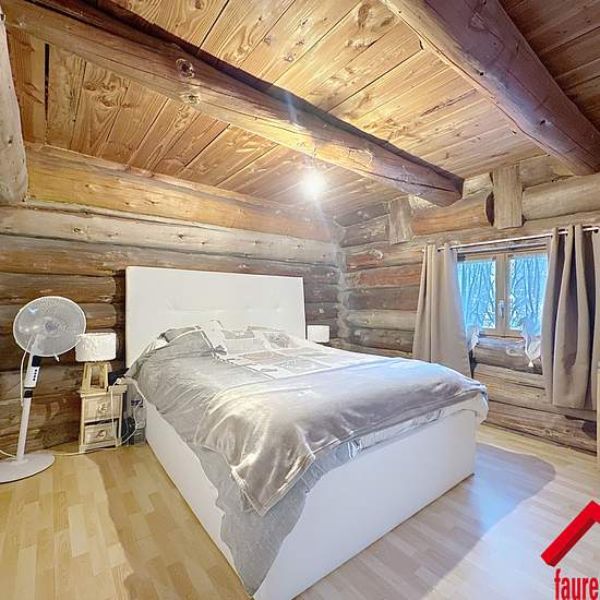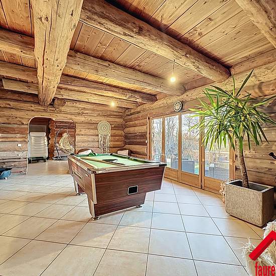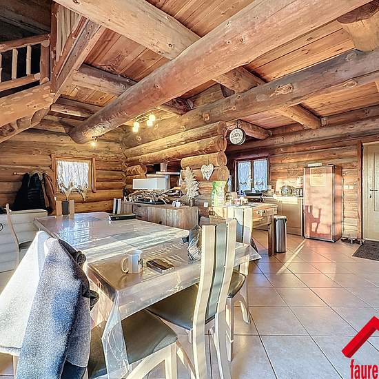 EXCLUSIVITE FAUREIMMO.FR/ Superbe maison meublée en rondins de 2005, DPE C avec pompe à chaleur, comprenant une entrée, un salon de jeux, un salon bibliothèque, une cuisine aménagée et équipée, une salle à manger et un WC. À l'étage, trois chambres, une salle d'eau avec WC et une mezzanine pouvant faire office de bureau, une cheminée apporte un vrai charme à l'ensemble, une terrasse plein sud de 80 m2 et un double garage de 220 m2 complètent le bien, le tout sur un terrain non clôturé de 4000 m2, un bien chaleureux et rare.