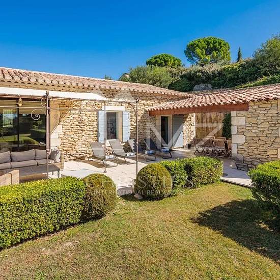 Cette belle maison en pierre, située dans un quartier calme à moins de 10 mn à pied du centre du village classé de Gordes vous séduira par la qualité de ses prestations : grande piscine sécurisée, chauffée et peu profonde, sur un jardin paysagé de 1900 m² environ, agréable terrasse ombragée, terrain de pétanque, vue sur le Luberon... L'intérieur a été soigneusement restauré et propose de grandes pièces lumineuses et climatisées, avec un excellent niveau de confort et d'équipement. 3 belles chambres sur deux niveaux, chacune avec sa salle de ...