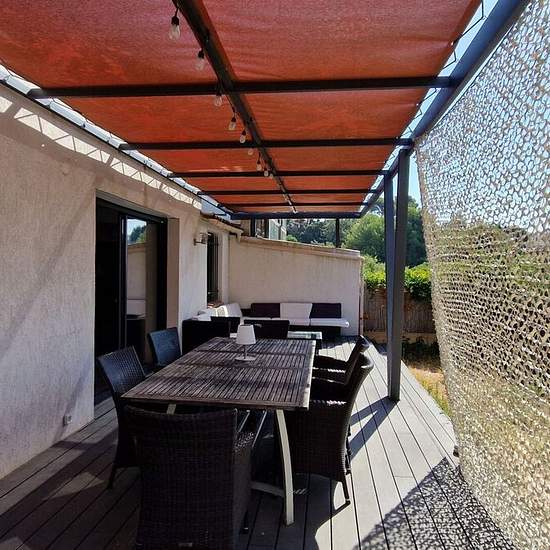 Iad France - Véronique Echelard vous propose : À louer à La Ciotat, dans les hauteurs de Saint Jean, Maison d'architecte de type T4 de 98 m² Loi Boutin (135 m² au sol) bâtie sur un terrain de 280 m². Location meublée d'un an, reconductible par tacite reconduction. De plain-pied, la maison comprend 3 chambres spacieuses avec placard dont 2 avec accès jardin, une salle d'eau moderne, une pièce de vie avec cuisine ouverte toute équipée, salon / salle à manger donnant sur un jardin avec terrasse ombragée et vue dégagée sur les vignes En sous-sol...