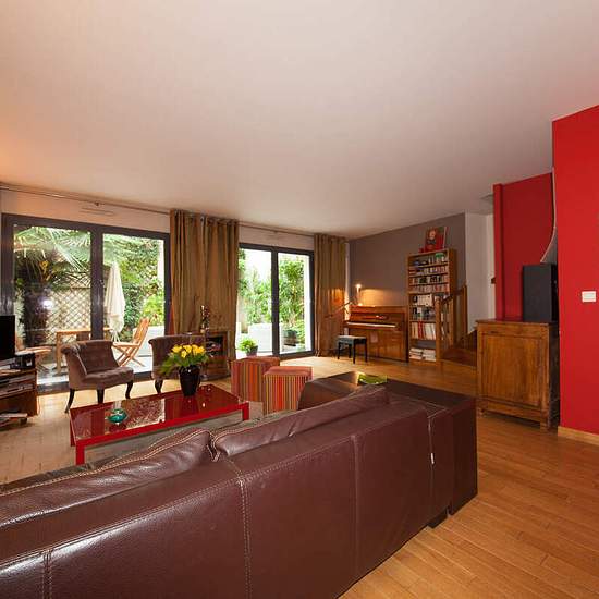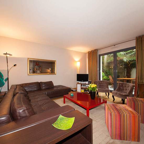 Exclusive 4-bedroom luxury apartment for rent in Paris. This is a delightful, spacious, stylish and very colorful flat with beautiful furniture and quality modern home appliances. It's a great option for those who appreciate beauty and comfort. Living surface - 165 square meters; the ground floor; capacity - up to 7 tenants; own green courtyard with a terrace. The large colorful living room offers a sofa, armchairs, TV, a chest of drawers, a coffee table, a music system, paintings, a carpet, lamps, a piano, a bookcase, parquet floor, the d...
