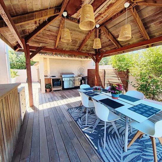 À seulement 300 mètres de la plage et d'un restaurant de plage renommé, cette charmante villa familiale offre tous les atouts pour un séjour idéal. En moins de 4 minutes à pied, vous serez au bord de l'eau. La villa dispose de 3 chambres climatisées, chacune avec sa propre salle d'eau pour une intimité préservée. La cuisine, récente et équipée, le séjour spacieux complètent les espaces intérieurs. À l'extérieur, vous trouverez 6 transats autour de la piscine, un espace détente, deux espaces repas et une cuisine d'été pour des moments convivi...