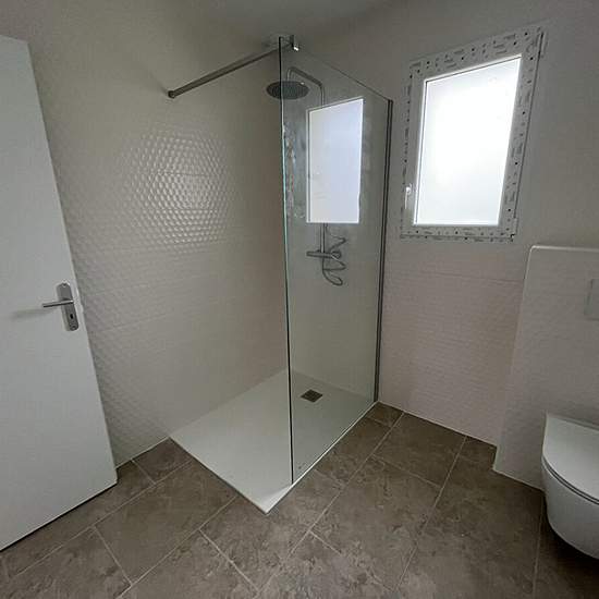 Maison neuve comprenant : une pièce de vie avec cuisine équipée (four, plaque, hotte), WC indépendant, une salle d'eau avec WC, 3 chambres avec placard, un cellier, et un garage avec ouverture motorisée. un jardin clôturé.
