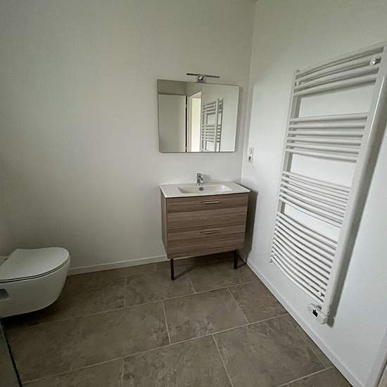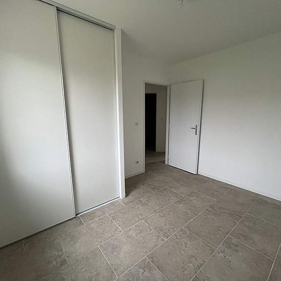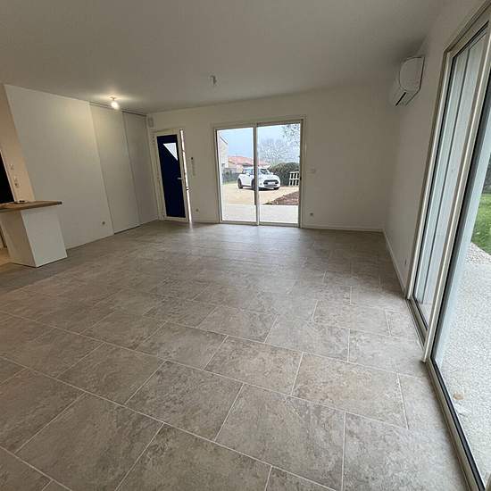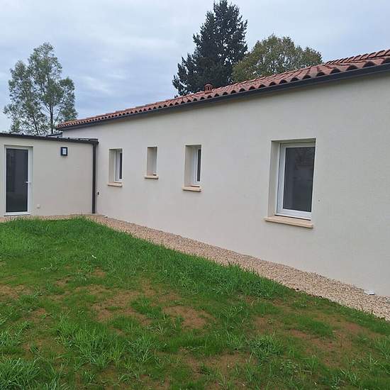 Maison neuve comprenant : une pièce de vie avec cuisine équipée (four, plaque, hotte), WC indépendant, une salle d'eau avec WC, 3 chambres avec placard, un cellier, et un garage avec ouverture motorisée. un jardin clôturé.