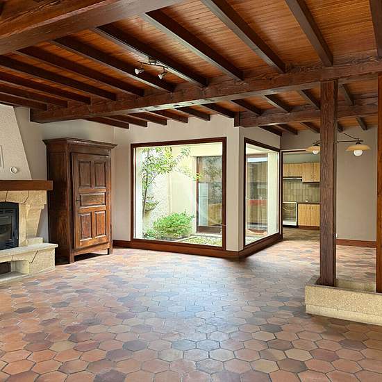Maison de caractère se composant : Au rez-de-chaussée, une entrée donnant accès à une pièce de vie de 50m², un patio intérieur et une cuisine séparée aménagée, un cellier avec douche italienne et WC séparé. A l'étage, 3 chambres dont une avec dressing, 1 salle de bains et WC séparé. Le tout sur un terrain de 221m² clos et arboré, avec terrasse. Chauffage insert bois avec radiateur, double vitrage et tout à l'égout. Disponible au 19 janvier Pour tout complément d'informations merci de prendre contact avec le service location au .