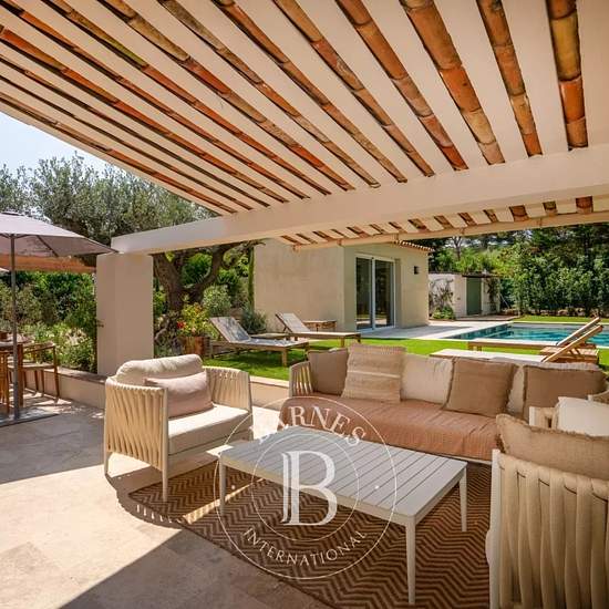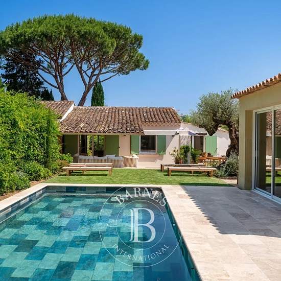 Cette élégante villa, récemment rénovée, bénéficie d'un emplacement idéal à proximité immédiate du village de Saint-Tropez et de la plage des Canoubiers. La maison principale dispose d'un séjour spacieux et baigné de lumière, d'une cuisine et salle à manger ouvertes sur l'extérieur ainsi qu'une chambre en suite. Deux dépendances, chacune avec chambre et salle de douche en suite, complètent harmonieusement les espaces de vie. Le jardin, soigneusement arboré, offre plusieurs coins détente, une cuisine extérieure, plusieurs terrasses, un carpor...