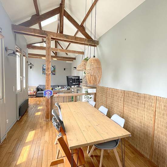 Charmante maison de ville d'une surface habitable d'environ 108m² (75.68 m² en loi Boutin) composée, au rez-de-chaussée, d'une entrée desservant une chambre parentale avec dressing et salle de bains avec wc, une autre chambre avec placard, une salle de douche avec wc; à l'étage, un magnifique séjour- salle à manger cathédrale avec poutres apparentes et 6,5m de hauteur et une belle cuisine équipée refaite en 2021. En souplex, vous trouverez une 3ème chambre avec placard, avec wc et lave-mains, une buanderie et un accès garage. Durée de locati...