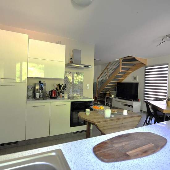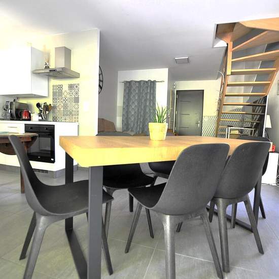 Maison meublée élevée en rez-de-chaussée d'1 entrée, 1 WC, 1 cuisine aménagée et équipée, 1 cellier; à l'étage 1 couloir, 3 chambres, 1 salle de bains avec WC; garage et carport; jardin sans vis-à-vis au calme. Le tout en parfait état. Bien disponible au 05 / 12 / 2025.