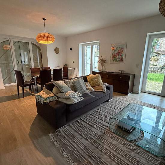 A louer ! Charmante maison meublée en pierre composée en rez-de-chaussée d'une entrée, un WC, une belle pièce de vie et une cuisine équipée. A l'étage, trois chambres, une salle d'eau, un coin bureau et un WC. Jardin avec piscine.