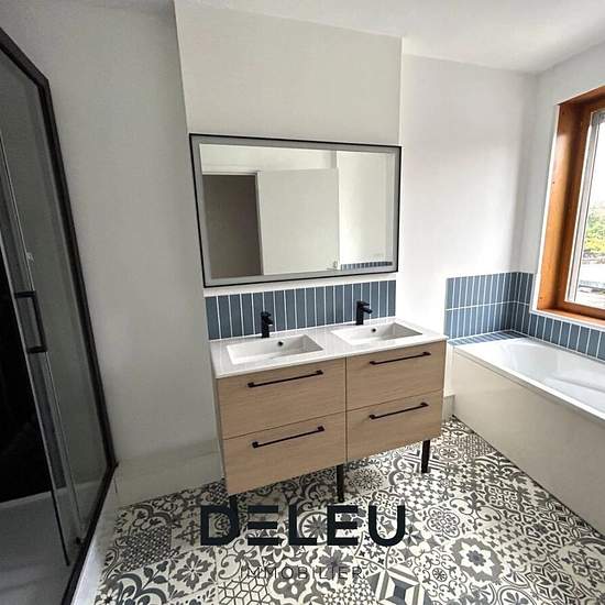 MAISON 100m² A LOUER SUR WAMBRECHIES Maison type 1930 entièrement rénovée avec 3 chambres et jardin. Rez-de-chaussée : hall, séjour, cuisine équipée (four, plaque, hotte), wc, buanderie et jardin exposé sud-ouest. Etage 1 : palier distribuant une grande chambre et une salle de bain complète (bain, douche, vasque et wc). Etage 2 : deux chambres supplémentaires. Située à 10 minutes à pied du centre-ville, transport en commun à proximité immédiate, école et axe routiers. Disponible de suite. Loyer hors charges : 1070.00e Provision du charges : ...