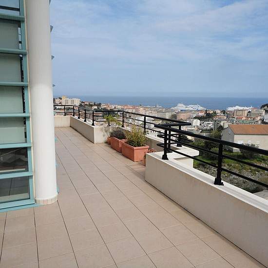 Appartement en duplex de Type 5, situé au 5ème étage avec ascenseur, composé au 1er niveau d'un séjour climatisé, une salle à manger, une cuisine équipée (éléments hauts et bas, plaque, hotte, four, lave-vaisselle, réfrigérateur, micro-ondes), un wc et une grande terrasse avec vue mer (55 m²) ; puis au second niveau : un dégagement, 2 chambres avec placards aménagés et climatisations, 2 chambres dont une avec placard aménagé, une salle de bains avec wc, une salle d'eau et 2 balcons. Le logement comprend un garage double en sous-sol.