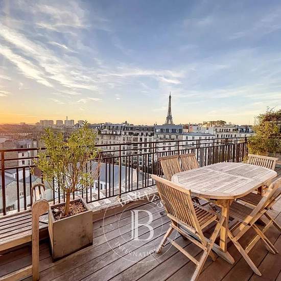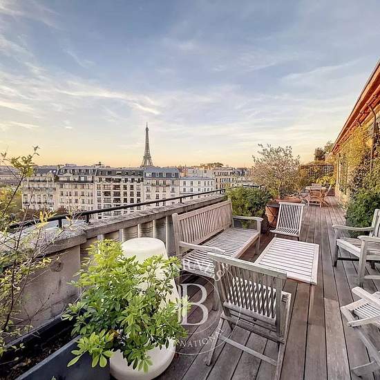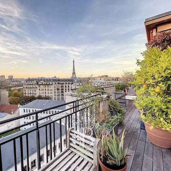 Dans le cœur du quartier des Invalides, situé au 7ᵉ et dernier étage avec ascenseur d’un immeuble sécurisé avec gardien, un superbe appartement meublé de 156,55 m² bénéficiant d’une exceptionnelle terrasse paysagée offrant une vue imprenable sur la Tour Eiffel. Ce bien se compose d’une entrée, d’un élégant salon, d’une salle à manger ainsi que d’un petit salon ouvrant directement sur la terrasse, d’une cuisine aménagée et entièrement équipée, de deux chambres, d’une salle de douche, de toilettes séparées, ainsi que d’une suite parentale disp...