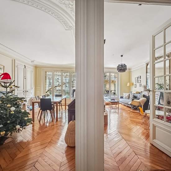 Grand F5 lumineux — 125 m² — Potentiel 4ᵉ chambre 183bis rue du Faubourg Poissonnière — Paris 9ᵉ 1er étage avec ascenseur — Immeuble haussmannien fin XIXᵉ Le bien Dans un bel immeuble haussmannien de la fin du XIXᵉ siècle avec tout le charme de l'ancien : moulures, boiseries, parquet pointe de Hongie, cheminées, cet appartement meublé de 125 m², situé au 1er étage avec ascenseur, séduit par sa belle hauteur sous plafond, ses volumes généreux et sa luminosité naturelle. La distribution est fluide, fonctionnelle et facilement modulable, permet...