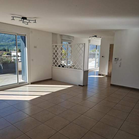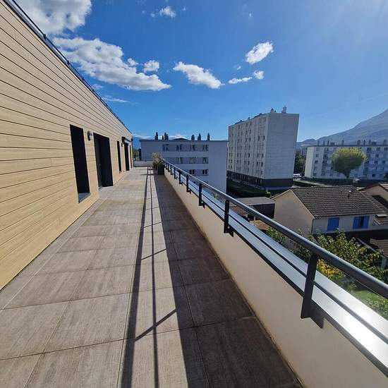 Saint-Egrève, dans immeuble récent, Résidence Villa Fiancey, Superbe appartement de type T5 traversant d'une surface de121 m² au 3ème et dernier étage avec ascenseur. Comprenant un hall d'entrée, donnant sur belle pièce de vie de 53 m² et cuisine ouverte, avec magnifique terrasse de 65 m². Une chambre parentale avec dressing et salle de bains / wc. Un couloir amenant sur toilettes et salle d'eau, une partie nuit desservant 3 chambres avec placards. Chauff ind gaz + climatisation. DPE Cat. C Montant estimé des dépenses d'énergie pour un usage...