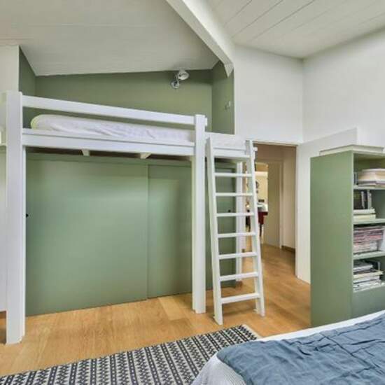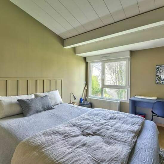 EXCLUSIVITE A 10 mn du centre ville à pieds : commerces, écoles, Bus pour le Lycée international / accès possible en vélo, 15 mn du RER à pieds, esprit maison pour cet appartement contemporain de 150.58 m2 loué meublé représentant tout le premier et dernier étage d'une Maison ancienne 1950 divisée et agrandie en Ossature Bois très moderne avec jardin privatif de 100 m2 environ et entrée indépendante, agencé comme suit : entrée, séjour de avec poêle donnant sur terrasse de 21 m2 au calme avec vue sur le jardin sans vis à vis, cuisine ouverte ...