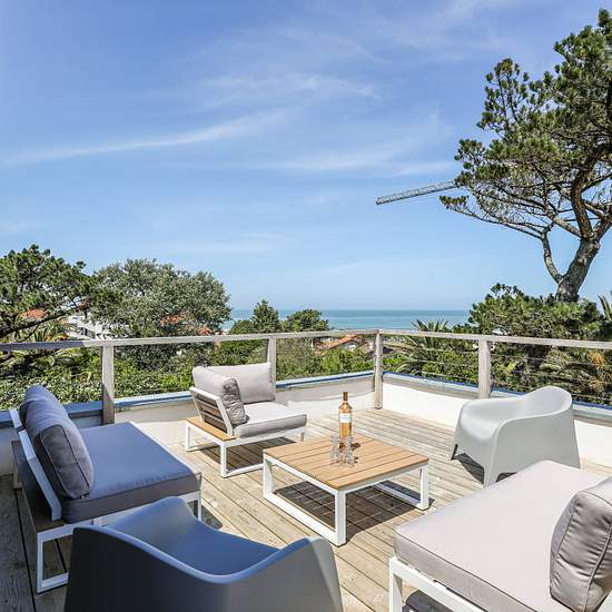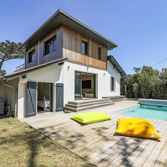 LOCATION SAISONNIERE : Magnifique villa de 160m² prévue pour 8 personnes, située au calme, près des plages d'Anglet et de toutes les commodités, bénéficiant de 2 terrasses avec vue, piscine et douche extérieure. Au rez-de-chaussée : entrée avec rangement (lave-linge et sèche-linge), toilettes pour invités, salon doté de grandes baies vitrées donnant sur la piscine, cuisine tout équipée et ouverte sur une 1ère terrasse extérieure, petit espace douche, chambre avec 2 lits simples (possibilité d'un lit double), suite parentale avec lit "king si...