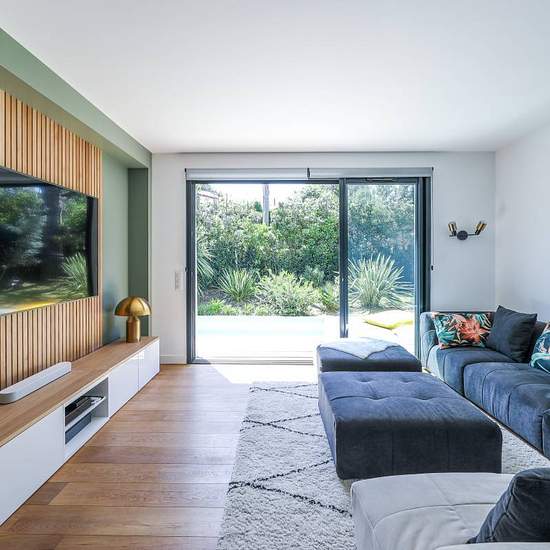 LOCATION SAISONNIERE : Magnifique villa de 160m² prévue pour 8 personnes, située au calme, près des plages d'Anglet et de toutes les commodités, bénéficiant de 2 terrasses avec vue, piscine et douche extérieure. Au rez-de-chaussée : entrée avec rangement (lave-linge et sèche-linge), toilettes pour invités, salon doté de grandes baies vitrées donnant sur la piscine, cuisine tout équipée et ouverte sur une 1ère terrasse extérieure, petit espace douche, chambre avec 2 lits simples (possibilité d'un lit double), suite parentale avec lit "king si...