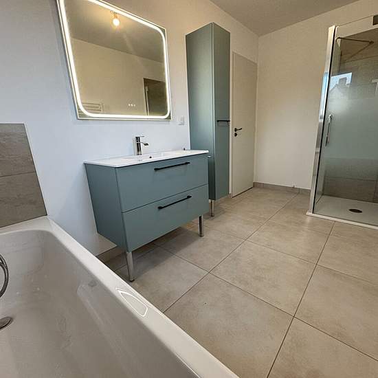 A proximité de la pharmacie de BELBEUF, pavillon neuf, individuel de 109 m² composé au RDC : Une pièce de vie de 40 m² comprenant un séjour-salon ouvert sur une cuisine AE, un cellier, un WC avec lave-mains. A l'étage : Un dégagement avec placard desservant 3 chambres avec dressing dont 1 avec sa salle de douche privative, une salle de bains + douche, un WC indépendant avec un lave mains Jardin exposé Sud-Ouest avec terrasse. Garage 1 voiture attenant et 2 places de parking privatives . Huisseries en aluminium et volets roulants électriques....