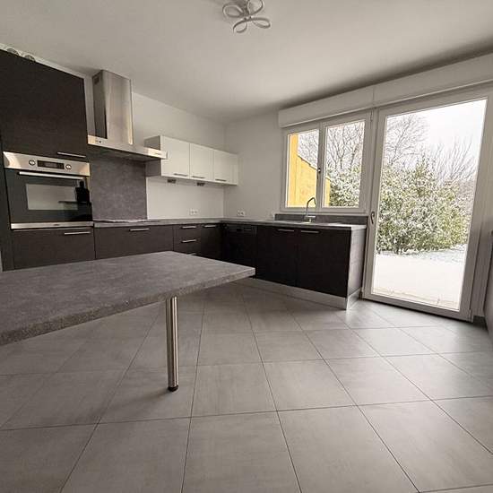 Maison Budling 5 pièce(s) 141 m2. Maison F5+ à louer sur la commune de Budling. Cette charmante maison de 141m2, mitoyenne des deux côtés, a été construite en 2010. Elle offre de beaux volumes et sera idéale pour une famille. Elle se compose comme il suit : Au rez-de-chaussée : une entrée couloir avec placards, un salon -séjour de 35,69m2 avec accès à l'extérieur, une cuisine semi ouverte équipée (plaques de cuisson, four, hotte et lave vaisselle), une buanderie ainsi qu'un wc. A l'étage : un beau palier avec placards dessert quatre ...