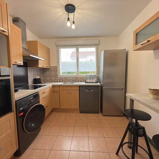 Maison de 5 pièces entièrement rénovée comprenant au rez de chaussée une entrée, une cuisine aménagée et équipée, un séjour, un toilette, un garage. A l'étage un dégagement, 3 chambres, placard, une chambre parentale avec salle d'eau -toilette et placard, une salle de bains, un toilette. L'ensemble édifié sur un terrain de 172 m². PROCHE ÉCOLES - COLLÈGE - BUS ! Revenu minimum demandé : 5 100 euros net / mois