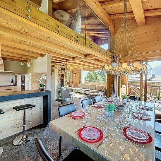 Très beau chalet, de 2010, d'une superficie de 180 m², situé dans un secteur très calme à proximité du village de Combloux et du Lac Biotope. Il se compose d'une entrée, dressing, un WC invités, une chambre avec un lit en 160 et sa salle de douche et WC, une belle et lumineuse pièce de vie avec séjour, cuisine ouverte tout équipée (sans congélateur & freezer), salon avec cheminée, accès sur une belle terrasse Sud face au Mont Blanc et accès au jardin. A l'étage une mezzanine bureau, un espace salon TV. Au Rez de chaussée : une chambre avec d...