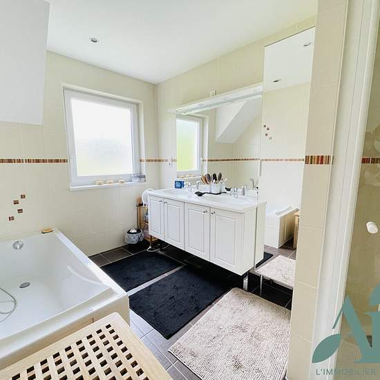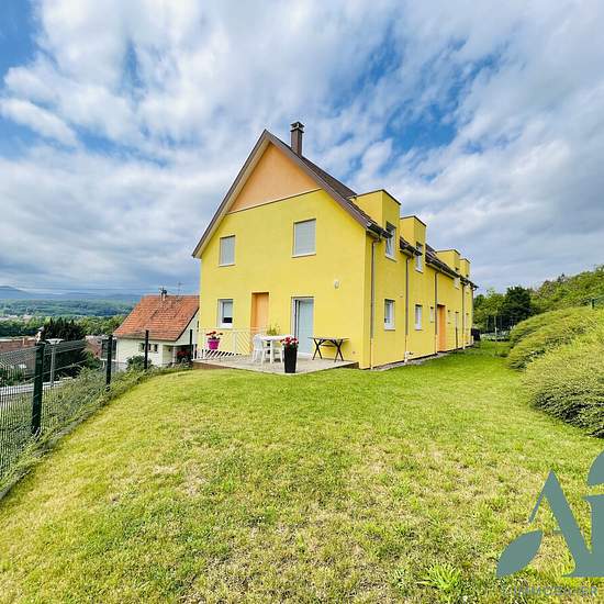 À Dinsheim-sur-Bruche, à proximité immédiate de Molsheim, des commerces et de toutes les commodités, découvrez cette spacieuse maison mitoyenne d’un côté, offrant une superbe vue dégagée sur les hauteurs du village. Elle développe 115 m² habitables. Le rez-de-chaussée comprend : • un grand salon-séjour lumineux ouvert sur une cuisine américaine, avec accès direct à la terrasse et au jardin privatif entièrement clos, • un dégagement avec rangements, • une petite chambre ou bureau, • un WC séparé. À l’étage, un palier dessert : • trois belles ...