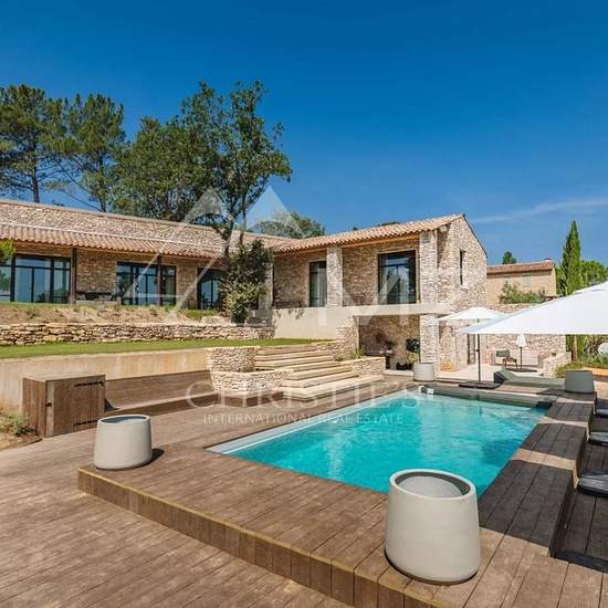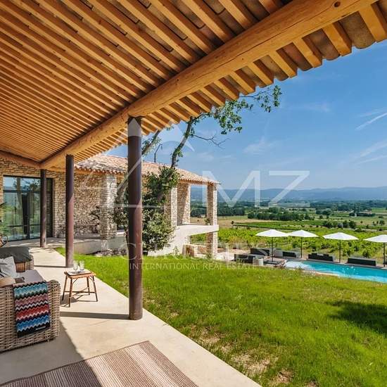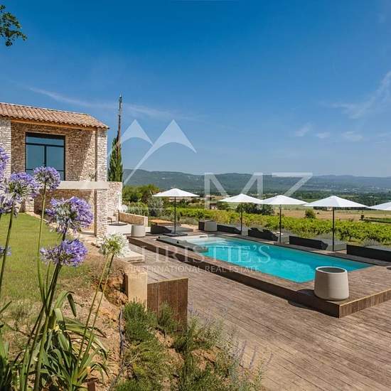 À quelques encablures du centre du village de Gordes, se dresse cette propriété unique, découvrant une vue dégagée et panoramique face à la campagne gordienne et un authentique moulin provençal. Un jardin délicatement paysagé intègre une belle piscine chauffée agrémentée de confortables sunbeds et de larges parasols. Vous serez immanquablement séduits par la qualité et le degré de raffinement des intérieurs. Une décoration originale, chaleureuse, soignée et recherchée, qui mêle subtilement les matières et matériaux (rideaux en lin, murs à la...