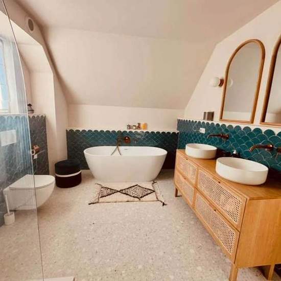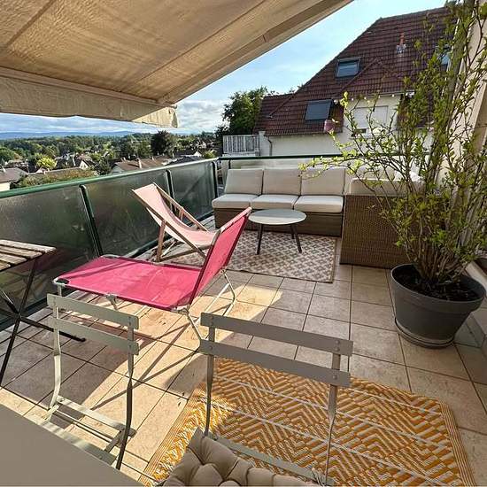 Je loue mon appartement duplex refait à neuf et meublé à Hegenheim (France): Dernier étage ascenseur, 158m², trois chambres, trois sdb avec baignoire et douche, terrasse aménagée, buanderie, grande cuisine toute équipée, buanderie avec machine à laver et sèche linge, plusieurs dressings, espace bureau. L’ensemble des matériaux sont haut de gamme. L’ameublement comprend deux lits 160 avec matelas neufs, un canapé lit, une table basse, une table à manger et 4 chaises, 3 chaises de bar, une commode, un bureau et un fauteuil, luminaires, machine...