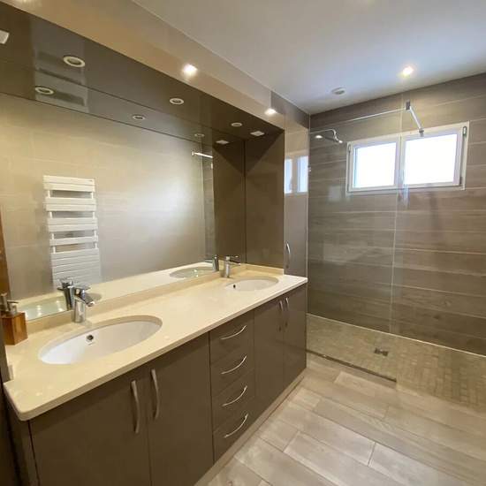 Immobilière Thomas Depresle vous propose une maison récente de plain-pied de 100 m², offrant de belles prestations, sur un terrain de 635 m² avec un accès direct au bois Saint-Martin. Elle se compose d’une entrée, d’une cuisine aménagée et équipée ouverte sur un séjour de 37 m², ainsi que d’un couloir desservant deux chambres dont une avec placard, une salle d’eau et des WC séparés. Dotée de nombreux rangements, elle dispose également d’une buanderie et d’un garage avec point d’eau et WC. Au-dessus du garage, des combles ont été aménagés en ...