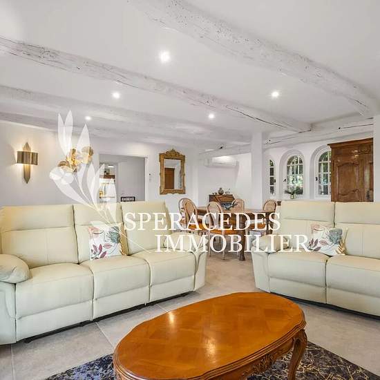 Disponible à la location, bail mobilité. Située dans un secteur résidentiel calme et recherché du Tignet, cette superbe maison en pierres offre un cadre de vacances idéal entre nature, confort et sérénité. Entourée d'un terrain arboré de près de 1 800 m², la propriété invite à la détente grâce à ses espaces extérieurs soignés, une grande piscine exposée plein sud, et plusieurs coins ombragés ou ensoleillés selon vos envies. Dès l'entrée, vous serez séduits par la belle luminosité de la pièce à vivre, agrémentée d'une élégante cheminée en pie...