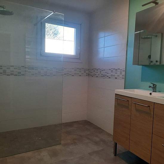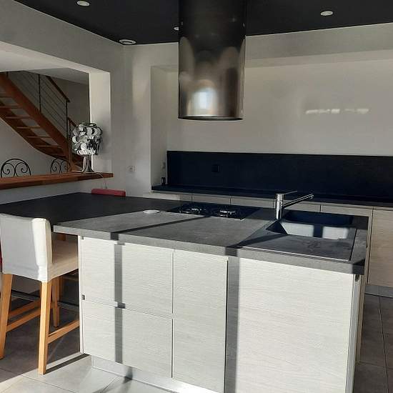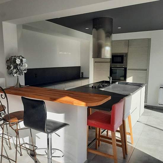 Quartier résidentiel, chemin du Mas de Blanc Cette maison individuelle, de type 7, sur deux niveaux, dispose : RDC : - Un appartement communiquant de type 2, avec une pièce principale avec coin cuisine, une chambre, une salle d'eau, un WC indépendant. - La partie principale comprenant une entrée, un séjour/salle à manger, une cuisine ouverte, deux chambres, une salle de bains et un WC indépendant. 1er étage : deux chambres, une salle de bains et un WC indépendant. Les équipements : Chauffage électrique, eau chaude par cumulus, poêle à granul...