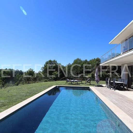 Exceptionnel. Sur la commune de Grasse. A 15/20 minutes de MOUGINS, du CIV, de ICS et de la Mougins British School. Disponible maintenant. Au calme absolu. Superbe vue panoramique mer Sud. Calme. Villa meublée récente et contemporaine de 220 m² approx (de 2020) sur beau terrain plat de 1500 m² approx avec piscine couverte (couverture roulante électrique). Grand séjour avec cuisine américaine (ilot central), arrière cuisine / buanderie, 4 magnifiques chambres en suite avec salle d'eau, dressing et terrasse + 1 bureau (ou 5ème chambre). Pour c...