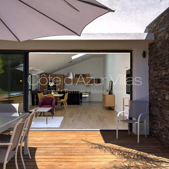 DISPONIBLE MI AOUT 2025 JUSQUE JUIN 2026 Belle villa contemporaine de 185 m² au calme avec localisation idéale pour les écoles internationales de Mougins et Valbonne. Rez-de-chaussée : Grand salon ouvert sur la cuisine entièrement équipée et salle à manger, buanderie, une chambre en suite avec salle d'eau, une chambre parentale ensuite avec salle d'eau et dressing. Toilettes invités. Premier étage : Deux chambres ensuite avec chacune avec sa salle d'eau et WC. Prestations supplémentaires : Piscine, alarme, internet fibre, volets roulants éle...