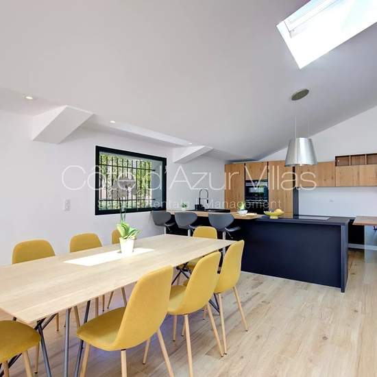 DISPONIBLE MI AOUT 2025 JUSQUE JUIN 2026 Belle villa contemporaine de 185 m² au calme avec localisation idéale pour les écoles internationales de Mougins et Valbonne. Rez-de-chaussée : Grand salon ouvert sur la cuisine entièrement équipée et salle à manger, buanderie, une chambre en suite avec salle d'eau, une chambre parentale ensuite avec salle d'eau et dressing. Toilettes invités. Premier étage : Deux chambres ensuite avec chacune avec sa salle d'eau et WC. Prestations supplémentaires : Piscine, alarme, internet fibre, volets roulants éle...