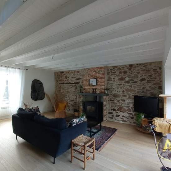 Maison Petit Mars. *Localisation: - Bourg Petit Mars: 5min - Gare Nort sur Erdre: 9min - Carquefou: 17 min * Distribution: Maison en pierres, offrant au rez-de-chaussée : un salon séjour avec son poêle à granules, une cuisine indépendante aménagée et équipée, une salle de bains avec baignoire et douche, un WC séparé. A l'étage : un palier, trois chambres dont une avec salle d'eau, et un WC séparé. *Extérieur: Terrain d'environ 749 m² à l'arrière de la maison avec terrasse et cabanon de jardin. Petit garage non attenant.
