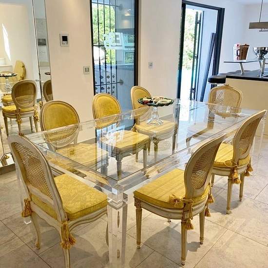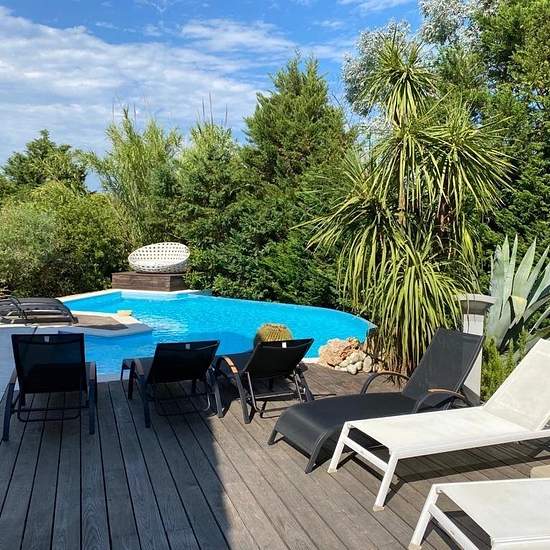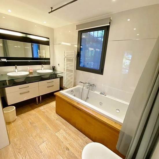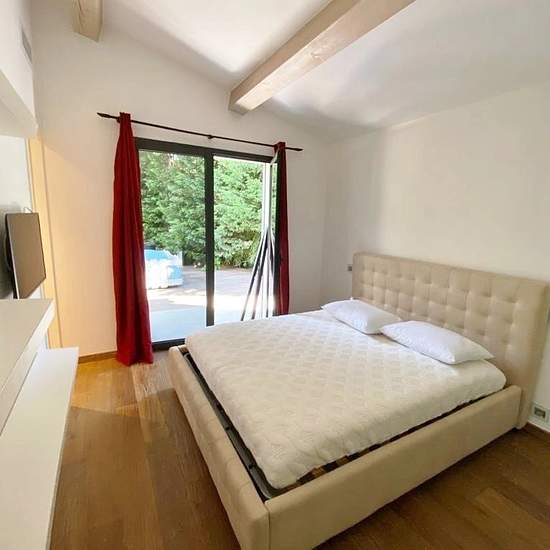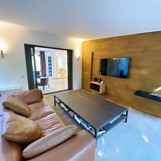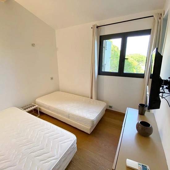 LOCATION RESIDENCE SECONDAIRE A L'ANNEE MEULBEE- Villa de style moderne d’environ 210 m2 sur un terrain de 1100 m2, située à moins de 500 mètres du Club 55 et offrant des prestations de grande qualité RDC : Séjour avec cuisine américaine et coin salle à manger – salon TV – 2 chambres (1 et 2) avec 2 salles de douches. Etage : Chambre principale (3) avec salle de bains – chambre (4) avec salle de douches. Toutes les chambres sont climatisées Jardin – Piscine – parking couvert – alarme – patio à l’arrière.