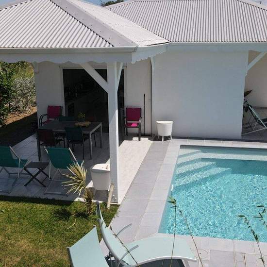 Saint François Guadeloupe Villa individuelle **** d'une superficie de 110 m² pour 4 à 7 personnes Dans son jardin exotique, la Villa dispose de deux terrasses entre lesquelles vous bénéficierez d'une piscine exterieure, d'un vaste séjour-cuisine où vous pourrez préparer vos repas en toute autonomie, d'une suite parentale avec lit Queen size et salle de bains privative avec douche et WC, d'une deuxième chambre avec lit Queen size et d'une troisième chambre avec deux lits simples ou lits rappochés. Vous disposerez d'une seconde salle de bains ...