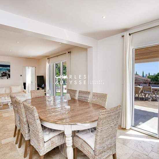 Belle villa neuve idéalement située à quelques minutes du centre ville et des plages de Pampelonne bénéficie d'une magnifique vue sur le chateau de la Messardière et d'un aperçu mer. Rénovée en 2019 et décorée avec goût, elle se compose d'un bel espace de vie, d'une chambre de maître avec dressing et sa salle de douche ainsi que de 2 chambres doubles partageant une salle de bain. Une 4eme chambre en annexe avec salle de douche et terrasse. A l'extérieur, un beau jardin, une grande piscine chauffée ainsi qu'un pool house avec store, table à m...
