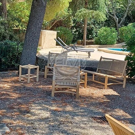 LOCATION SAISONNIERE A louer dans un petit lotissement au calme à environ 2 kms du centre ville de Ste Maxime et 1.5 kms des plages de La Nartelle, jolie villa de charme d'environ 150 m² sur 2 niveaux. Elle comprend en rdc : entrée, pièce à vivre ouverte sur terrasse avec tv et cheminée, grande cuisine ouverte entièrement équipée (lave vaisselle, four, réfrigérateur, plaques gaz, Nespresso, micro-ondes), 2 chambres dont 1 avec salle d'eau et wc, 2ème salle d'eau et wc séparés. La pièce de vie et une chambre sont climatisées. A l'étage : 2 ch...