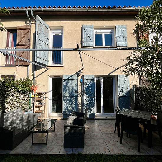 Maison MEUBLÉE de 86,21 m² avec garage et jardinet d'environ 80 m²située au 31 rue du Père Bergounioux à Toulouse. Elle se compose au rez-de-chaussée d'une entrée, d'un séjour et d'une cuisine ouverte. Au premier étage se trouvent 2 chambres, un dressing, une salle de bains et un WC. Le deuxième et dernier étage comprend une chambre mansardée et une salle d'eau avec wc sanibroyeur séparé La maison dispose également d''une terrasse et un car-port. Deux places de parking et stationnement facile dans l'impasse. Loyers charges comprises : 1350 e...