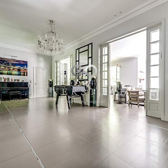 Exclusivité - Paris - La Muette - Rue du Conseiller Collignon En rez-de-jardin d'un bel immeuble en pierre de taille, un exceptionnel appartement de réception entièrement meublé et équipé de plus de 300m2. Il se compose d'une belle entrée desservant une grande réception donnant sur une terrasse et un beau jardin privatif, d'une très grande cuisine dînatoire, d'une suite parentale comprenant une chambre de 40m2 donnant sur le jardin avec « dressing Madame », d'un « dressing Monsieur », d'un salon télé, d'une vaste salle de bains avec jacuzzi ...