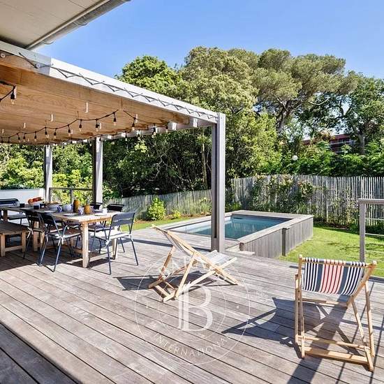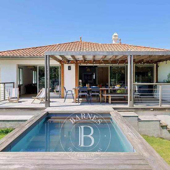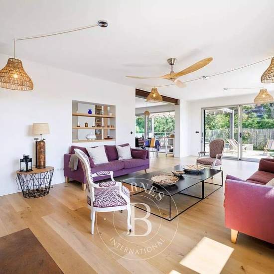 Située à quelques minutes de la plage de la Côte des Basques à Biarritz, cette villa de 210 m² offre un parfait équilibre entre intimité, confort et convivialité. Conçue pour accueillir de 8 à 10 personnes, elle saura charmer familles et groupes d’amis en quête de tranquillité, tout en étant proche du centre-ville. L’espace de vie se compose d’une pièce lumineuse ouverte sur le jardin, d’un salon principal jouxtant une salle à manger conviviale pouvant accueillir jusqu’à 10 convives, ainsi que d’une grande cuisine ouverte. Un second salon pl...