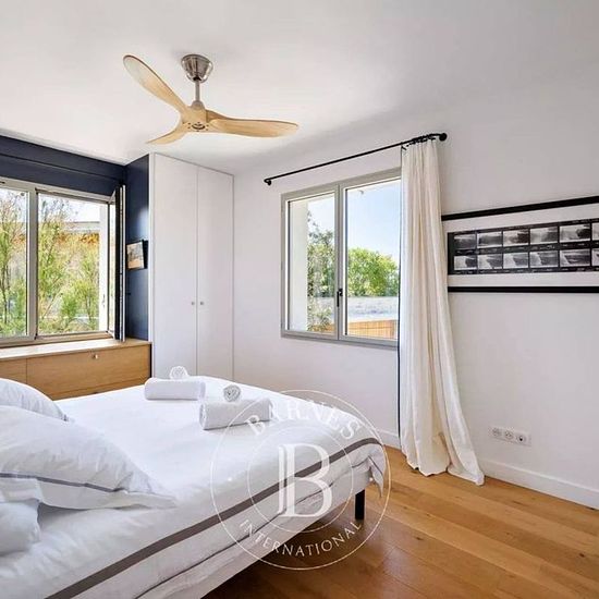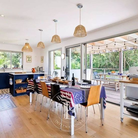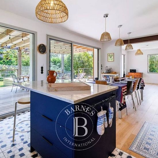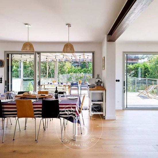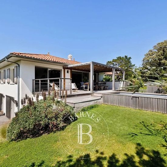 Située à quelques minutes de la plage de la Côte des Basques à Biarritz, cette villa de 210 m² offre un parfait équilibre entre intimité, confort et convivialité. Conçue pour accueillir de 8 à 10 personnes, elle saura charmer familles et groupes d’amis en quête de tranquillité, tout en étant proche du centre-ville. L’espace de vie se compose d’une pièce lumineuse ouverte sur le jardin, d’un salon principal jouxtant une salle à manger conviviale pouvant accueillir jusqu’à 10 convives, ainsi que d’une grande cuisine ouverte. Un second salon pl...