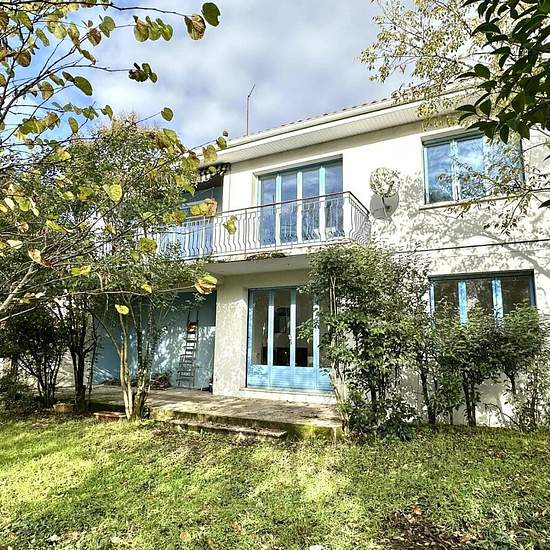 Idéalement située à proximité immédiate du tram C et du Parc Ausone, maison meublée de 150m2 baignée de lumière avec un grand garage de 37m2 et un terrain arboré de 1068m2 exposée Sud. Au rez de chaussée, une belle entrée avec escalier en marbre dessert un salon donnant directement sur le jardin, une chambre, une salle d'eau et une buanderie. A l'étage un séjour avec accès à la terrasse et au jardin par un escalier extérieur, une vaste cuisine aménagée et équipée, 3 chambres, une salle de bain et wc séparé. La maison dispose d'un grand garag...