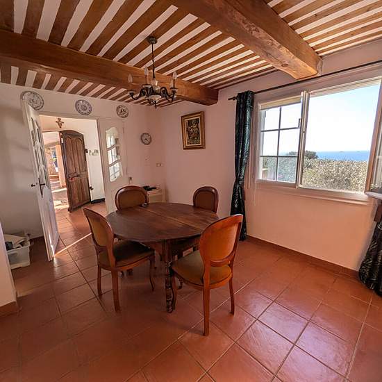 Carqueiranne vue mer : dans un domaine privé et sécurisé face à la mer, belle villa indépendante de 130 m² louée meublee. Au rdc, accessible par un escalier : entrée, salon, salle à manger, cuisine, toilettes. À l'étage : 2 chambres, une chambre parentale avec bureau pouvant faire office de chambre enfant, salle de bain et toilettes. Vue mer de chaque pièce de la villa, 3 parking dans le jardin, piscine avec couverture de sécurité, cuisine d'été, belles terrasses. Coin potager et terrain de pétanque. Alarme possible. Accès direct à la mer li...