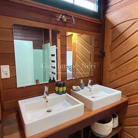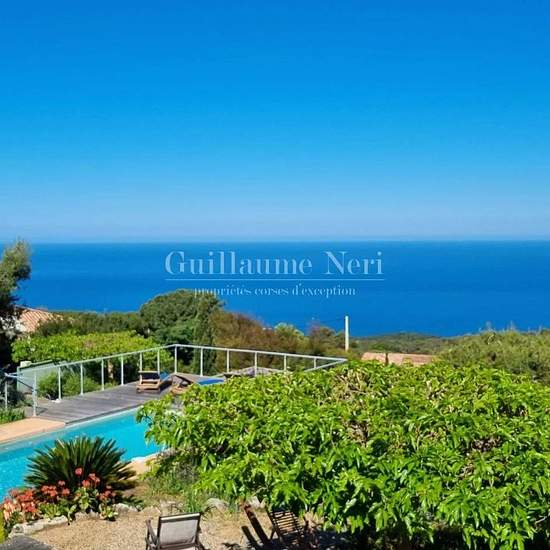 Située à Aqua Doria, cette charmante villa en bois avec sa dépendance vous offre une vue panoramique imprenable. Nichée au cœur d’une végétation méditerranéenne aux senteurs corses, elle se trouve à proximité de la plage. La villa principale dispose de 3 chambres, dont une à l'étage principal avec sa salle de bain et 2 chambres au rez-de chaussé, avec salle de bain commune et accès indépendant par l'extérieur. La dépendance de 50 m² comprend 2 chambres supplémentaires ainsi qu'une salle de douche. Une magnifique piscine avec terrasse complèt...