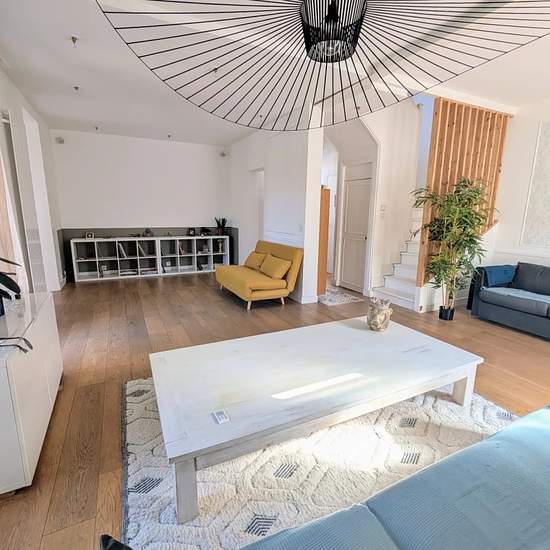 Villaret Immobilier vous propose à la location meublée, À 5mn à pied de la gare "La Barre Ormesson" (ligne H, 11mn de gare du Nord), et à 10mn à pieds du lac d'Enghien et du casino Barrière, dans la rue calme George Sand (les numéros pairs sont rattachés à Enghien les Bains, les numéros impairs à Deuil la Barre), Belle maison meulière traditionnelle transformée grâce à une extension récente construite en 2010. L'extension permet d'avoir un rez-de-jardin avec cuisine ouverte de 37 M2 sur l'espace extérieur (grande terrasses aménagée, jardin) ...
